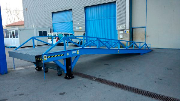 Rampa móvil para carga y descarga de camiones y contenedores. Con nivelación de altura para adaptarse al nivel de la plataforma.